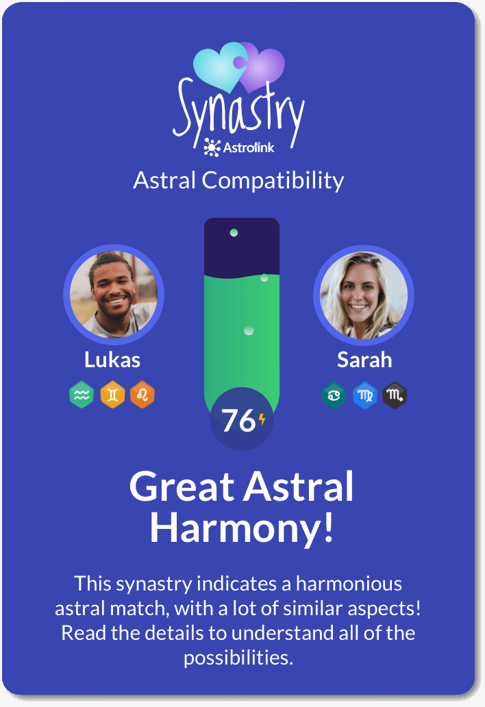 Each combination between two Charts has a unique and personalized result! Get a detailed analysis with information on astral harmony, basic affinities, energy comparison, relationship areas, and much more!